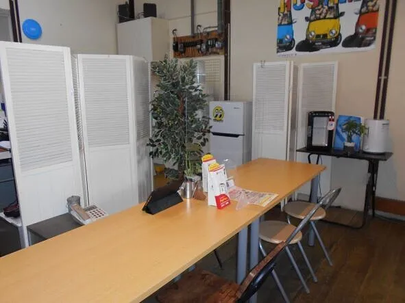 車検・修理に必要な設備が揃っています。また時間を気にせずご相談いただける商談スペースや、車検・修理中もゆっくりとお過ごしいただける待合スペースを完備しております。